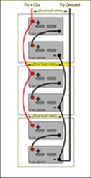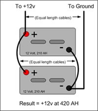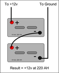 Een accu van 12 Volt bestaat eigenlijk uit 6 accucellen van 2 Volt die in serie geschakeld zijn: de pluspool wordt doorverbonden met de minpool etc. zodat het uiteindelijk potentiaalverschil 12 volt bedraagt. Meerdere 6 of 12 Volt accu's laten zich natuurlijk op dezelfde manier doorverbinden zodat uiteindelijk een opstelling van 12V, 24V of zelfs nog hoger wordt verkregen. De capaciteit blijft gelijk. Dus 2 x 6V/220Ah geeft een opstelling van 12V/220Ah.